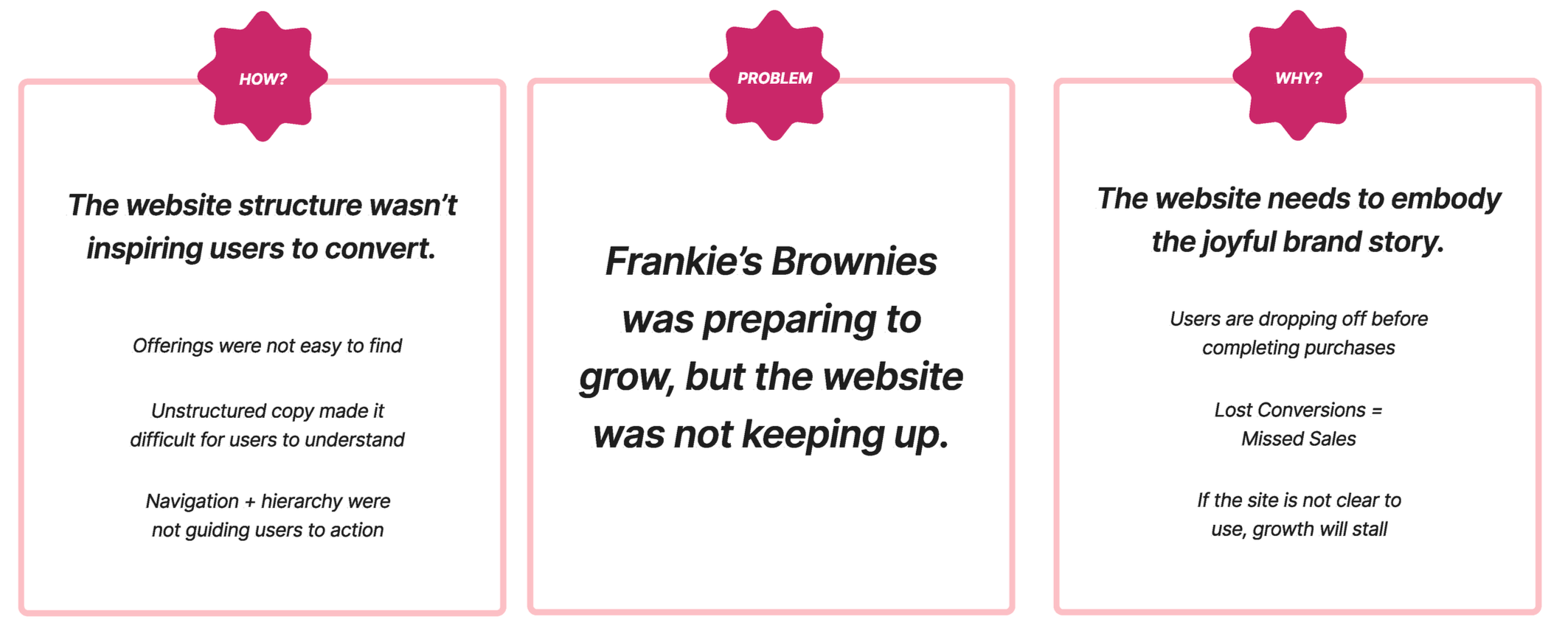 Abstraction laddering was a useful tool to understand the core of Frankie’s needs with the new site. Joining TikTok shop meant the possibility of many more sales, and the website needed to be able to keep up with the change + communicate Frankie’s joyful brand story.
